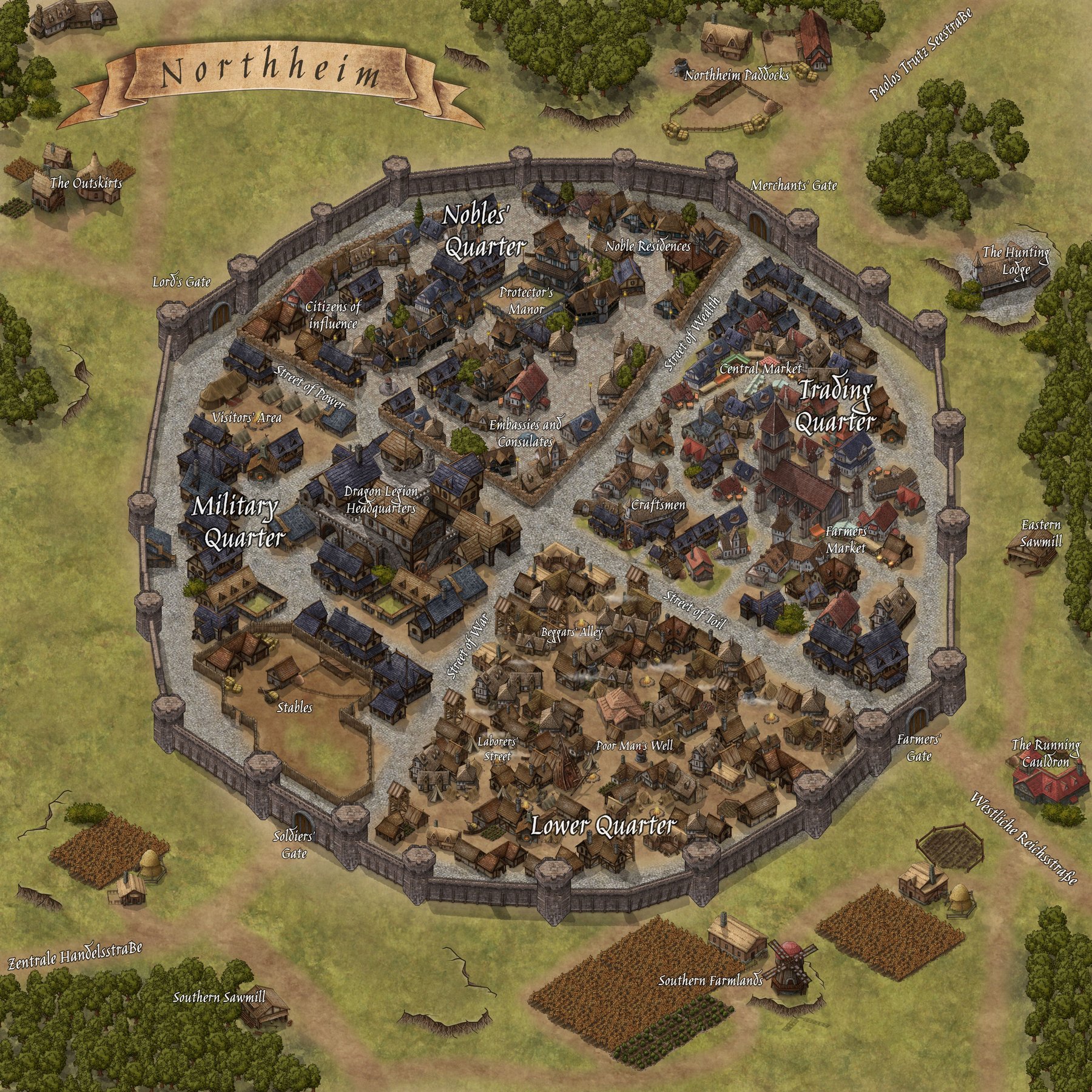 Quote from "Lunorth: From Hamlet to City, pp.8: 'Northheim'. A topographic description" [IT]๐๐ฐ๐ณ๐ต๐ฉ๐ฉ๐ฆ๐ช๐ฎ ๐ช๐ด ๐ต๐ฉ๐ฆ ๐ค๐ข๐ฑ๐ช๐ต๐ข๐ญ ๐ฐ๐ง ๐๐ถ๐ฏ๐ฐ๐ณ๐ต๐ฉ ๐ข๐ฏ๐ฅ ๐ฃ๐บ ๐ฆ๐น๐ต๐ฆ๐ฏ๐ด๐ช๐ฐ๐ฏ ๐ต๐ฉ๐ฆ ๐ฑ๐ฐ๐ญ๐ช๐ต๐ช๐ค๐ข๐ญ ๐ข๐ฏ๐ฅ ๐ฎ๐ช๐ญ๐ช๐ต๐ข๐ณ๐บ ๐ค๐ฆ๐ฏ๐ต๐ฆ๐ณ ๐ฐ๐ง ๐ต๐ฉ๐ฆ ๐๐ณ๐ฐ๐ต๐ฆ๐ค๐ต๐ฐ๐ณ๐ข๐ต๐ฆ. ๐๐ต ๐ช๐ด ๐ญ๐ฐ๐ค๐ข๐ต๐ฆ๐ฅ ๐ช๐ฏ ๐ต๐ฉ๐ฆ ๐ฏ๐ฐ๐ณ๐ต๐ฉ๐ฆ๐ข๐ด๐ต๐ฆ๐ณ๐ฏ ๐ฑ๐ข๐ณ๐ต ๐ฐ๐ง ๐๐ถ๐ฏ๐ฐ๐ณ๐ต๐ฉ, ๐ข๐ฏ๐ฅ ๐ต๐ฉ๐ถ๐ด ๐ข๐ค๐ต๐ด ๐ข๐ด ๐ข ๐ช๐ฏ๐ต๐ฆ๐ณ๐ฑ๐ณ๐ฐ๐ต๐ฆ๐ค๐ต๐ฐ๐ณ๐ข๐ญ ๐ฉ๐ถ๐ฃ ๐ง๐ฐ๐ณ ๐ต๐ณ๐ข๐ท๐ฆ๐ญ๐ญ๐ฆ๐ณ๐ด ๐ฐ๐ฏ ๐ต๐ฉ๐ฆ๐ช๐ณ ๐ธ๐ข๐บ ๐ต๐ฐ ๐ต๐ฉ๐ฆ ๐ฏ๐ฐ๐ณ๐ต๐ฉ๐ฆ๐ณ๐ฏ ๐ค๐ข๐ฑ๐ช๐ต๐ข๐ญ ๐ฐ๐ง ๐๐ข๐ฐ๐ญ๐ฐ๐ด ๐๐ณ๐ถ๐ต๐ป. [...] ๐๐ฐ๐ณ๐ต๐ฉ๐ฉ๐ฆ๐ช๐ฎ ๐ช๐ด ๐ข ๐ค๐ช๐ณ๐ค๐ถ๐ญ๐ข๐ณ ๐ค๐ช๐ต๐บ ๐ฅ๐ช๐ท๐ช๐ฅ๐ฆ๐ฅ ๐ช๐ฏ๐ต๐ฐ ๐ง๐ฐ๐ถ๐ณ ๐ฒ๐ถ๐ข๐ณ๐ต๐ฆ๐ณ๐ด, ๐ต๐ฉ๐ข๐ต ๐ฆ๐ข๐ค๐ฉ ๐ด๐ฑ๐ฆ๐ค๐ช๐ข๐ญ๐ช๐ป๐ฆ ๐ช๐ฏ ๐ท๐ข๐ณ๐ช๐ฐ๐ถ๐ด ๐ฅ๐ช๐ณ๐ฆ๐ค๐ต๐ช๐ฐ๐ฏ๐ด, ๐ข๐ฏ๐ฅ ๐ฉ๐ฐ๐ถ๐ด๐ฆ ๐ท๐ฆ๐ณ๐บ ๐ฅ๐ช๐ง๐ง๐ฆ๐ณ๐ฆ๐ฏ๐ต ๐ต๐บ๐ฑ๐ฆ ๐ฐ๐ง ๐ฑ๐ฐ๐ฑ๐ถ๐ญ๐ข๐ต๐ช๐ฐ๐ฏ๐ด.